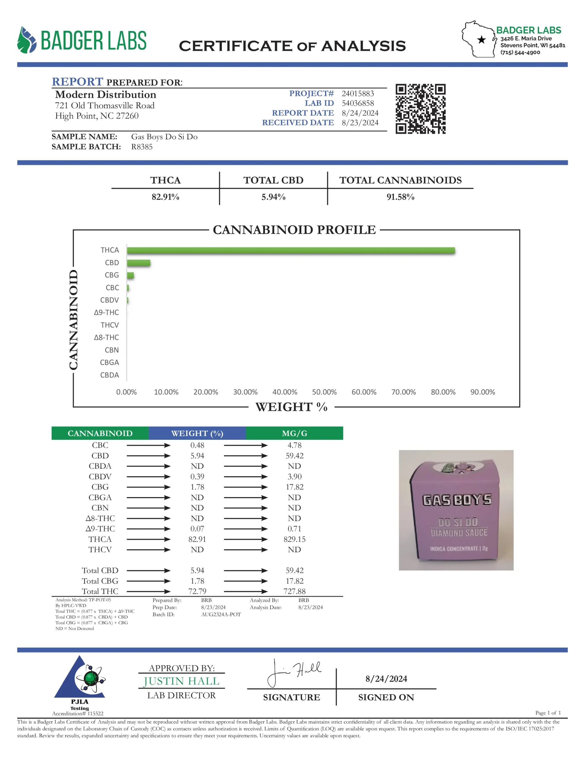 • Total Cannabinoids: 91.58%
